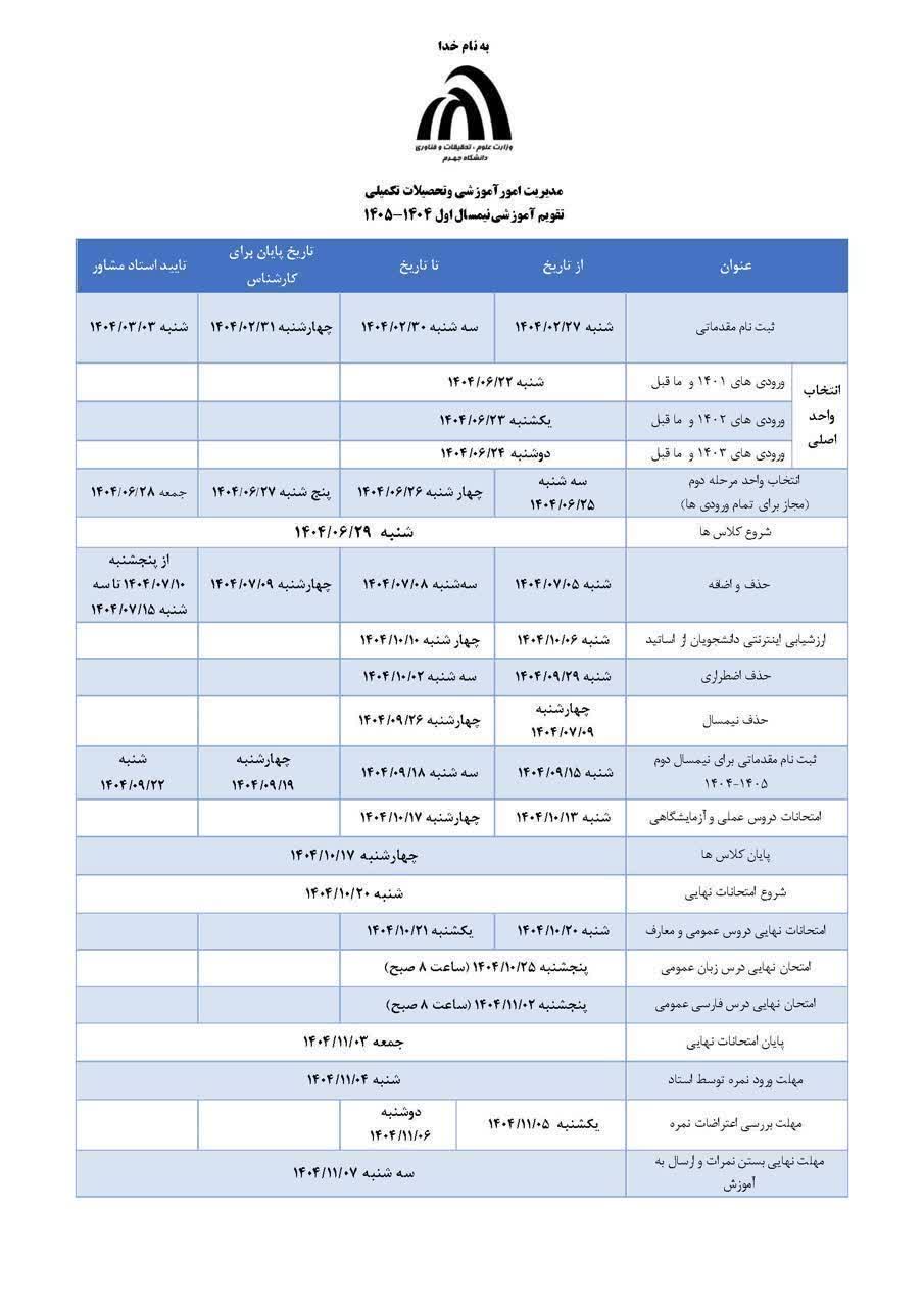 تقویم آموزشی نیمسال اول ۱۴۰۵_۱۴۰۴
