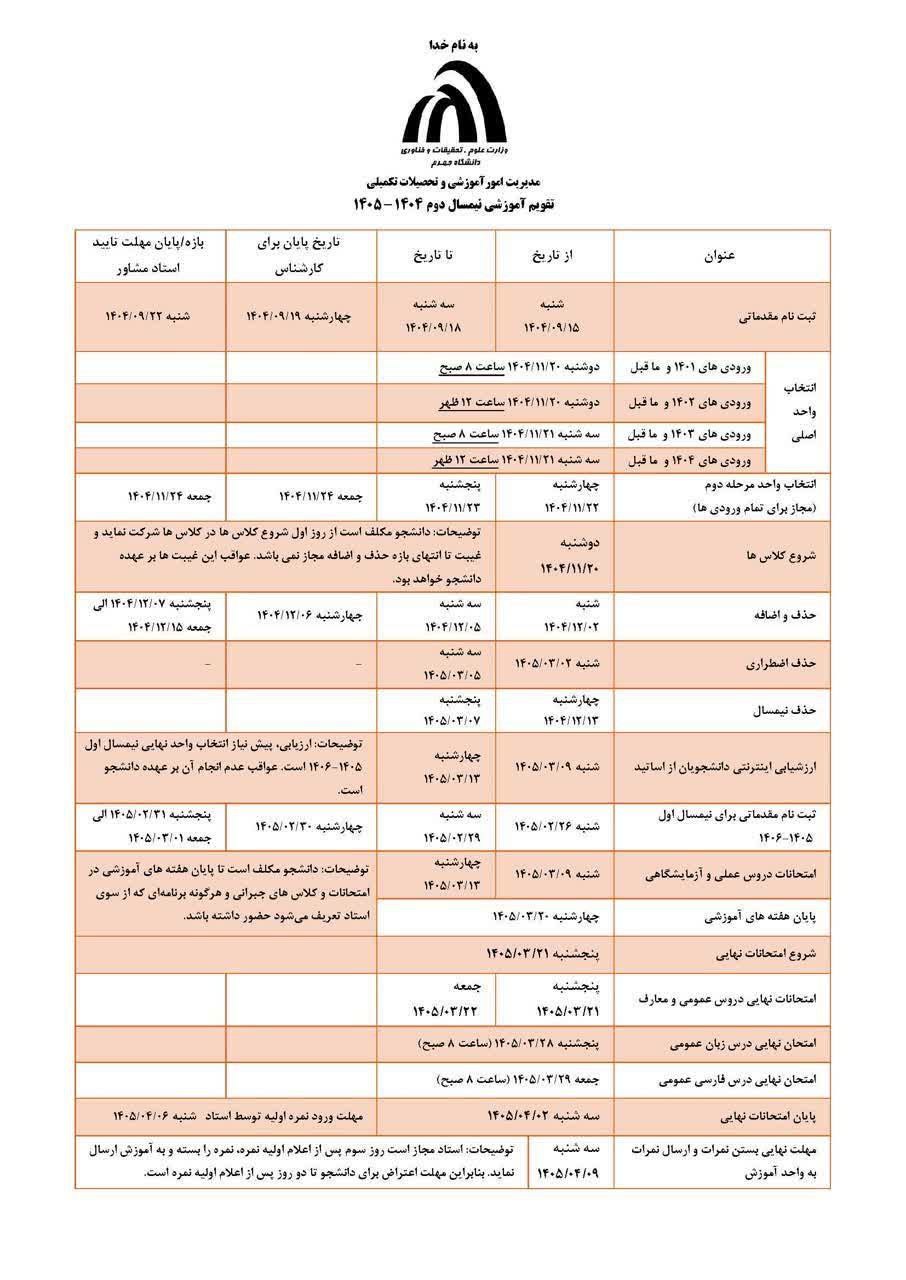 تقویم آموزشی نیمسال دوم ۱۴۰۴-۱۴۰۵