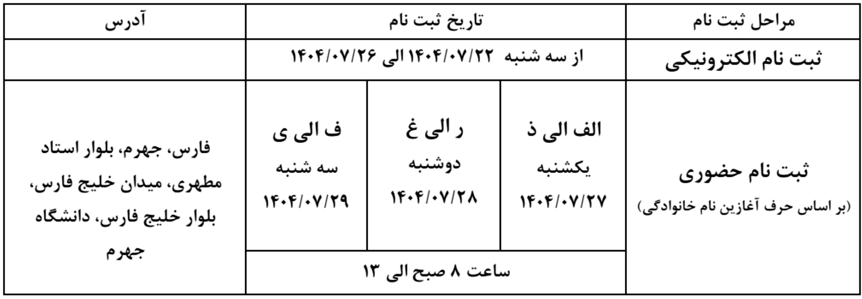 ضمن تبریک جهت پذیرش شما در دانشگاه جهرم، به استحضار می رساند ثبت نام از پذیرفته شدگان صرفاً طبق جدول زمان بندی ذیل و به دو صورت الکترونیکی و حضوری انجام خواهد شد (ثبت نام به هر دو شکل الزامی است). خواهشمند است از مراجعه در روزهایی غیر از تاریخ مشخص شده جهت ثبت نام حضوری، به مدیریت آموزشی دانشگاه خودداری نمایید.