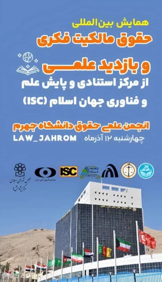همایش بین المللی حقوق مالکیت فکری روز چهارشنبه 12 آذرماه 1404 به میزبانی دانشگاه جهرم در مرکز استنادی و پایش علم و فناوری جهان اسلام (ISC) برگزار می گردد.